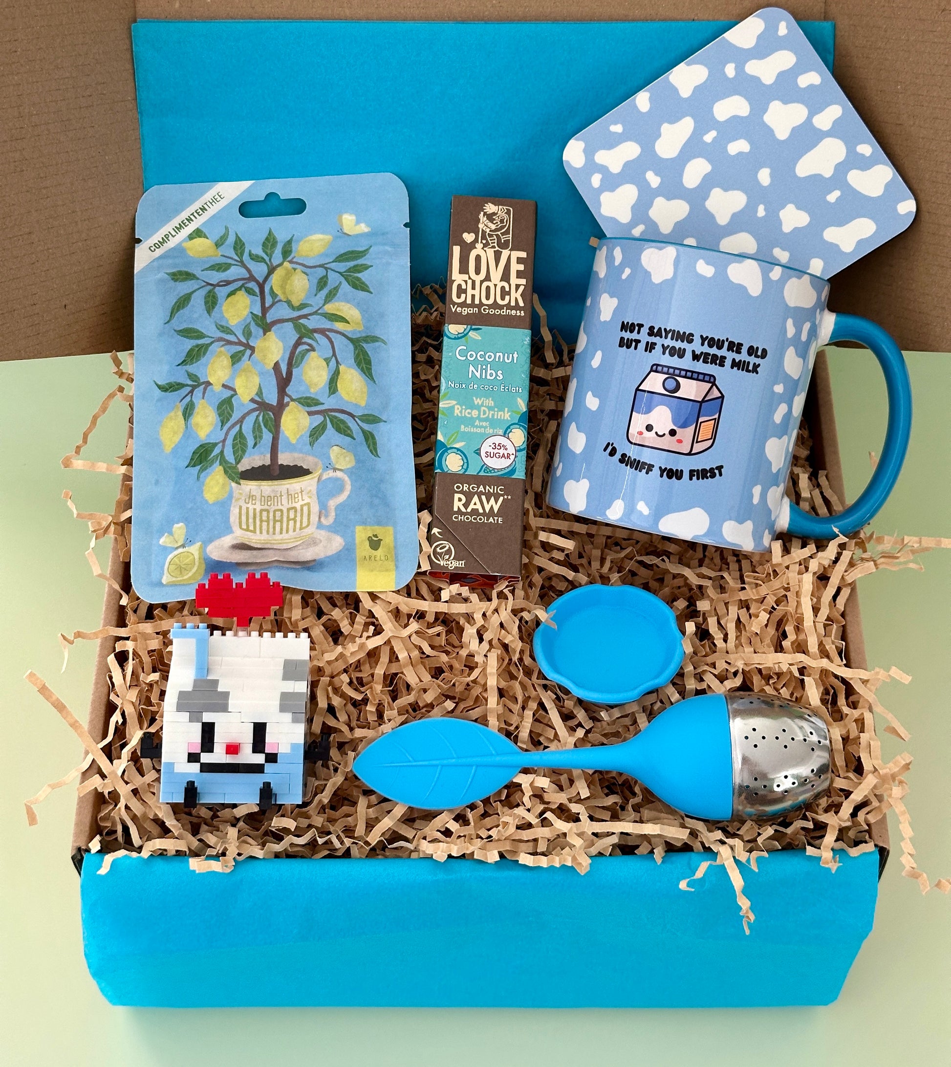 Make them laugh out loud with this quirky and cute box. It's perfect for birthdays or just-because gifting! Packed with a punny mug, a matching coaster, a mini building block milk carton, a tea infuser with its matching rest, a raw chocolate bar, a soothing tea blend, and your choice of card, it’s a playful little set made to brighten anyone’s day. ✨