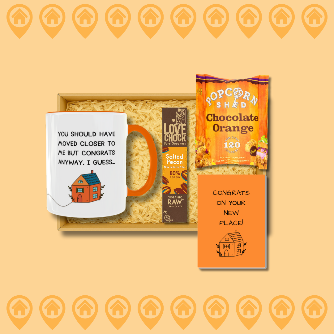 Celebrate their new place with a cozy little box of treats! This set includes a “You Should Have Moved Closer to Me” mug, chocolate orange popcorn, a raw chocolate bar, and your choice of card. A sweet (and slightly salty) way to say congrats on the new home. 🧡🏡
